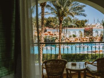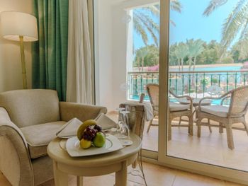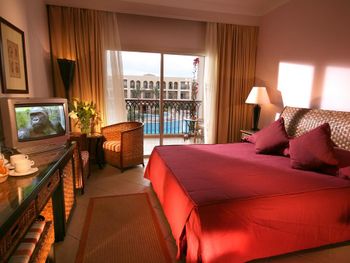 По приезду на ресепшн нас встретили с очередным египетским одолжением:). Сказали что нам «повысили уровень номера» и заселили в видовой (на бассейны) номер над рестораном второго этажа.