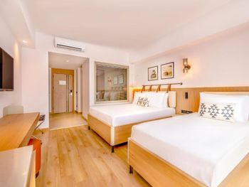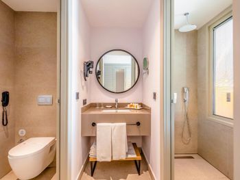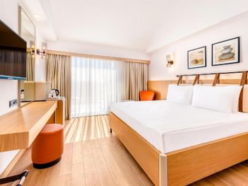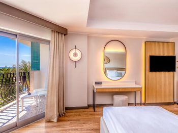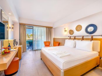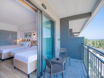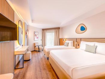 Номер был маленький,определенно требует реновации,зато близко к морю.Если этот фактор значения не имеет и хочется номер получше просите в главном корпусе-он дальше от моря,но новый.В душевой кабине помыться для человека чуть крупнее среднего телосложения(к примеру,мои ттх-190 см,95кг)-это надо извернуться.Постоянно слетали дверцы душевой кабины.Из мыльнорыльного-только мыло,ни шампуней,ни бальзамов,ни кремов нет.Тапочек,кстати,тоже нет.На 4м этаже на балконе не уединиться-отсутствуют перегородки с соседними номерами,лишь некое подобие поручней.Отель заточен под немцев-их 80%.Вся анимация на немецком-ребенку было не интересно.Отель большой,на 1,5 тысячи человек,периодически образуются очереди на барах и в ресторанах.