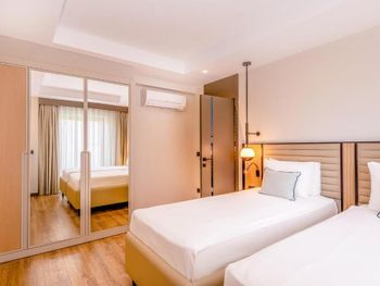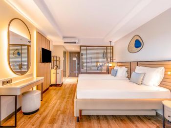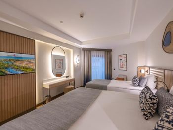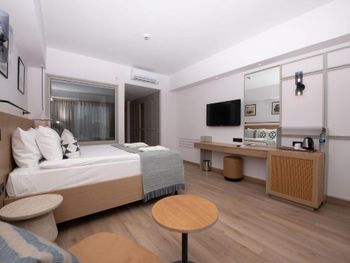 Все номера курортного отеля Belek Beach оформлены в строгом современном стиле. В каждом номере есть гостиная зона и собственная ванная комната с феном. Из окон большинства номеров открывается вид на море. Для детей обустроена игровая площадка. В отеле также имеется собственный причал.