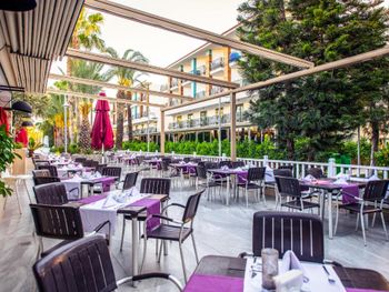 Хороший отель с удобным расположением, везде чисто, убирались в номере каждый день, в ресторане хороший выбор , подойдёт и для вегетарианцев , и для мясоедов, рыба каждый день, креветки , мидии, много овощей и фруктов, была гречка( что редко встречается в отелях Турции), пюре картофельное, салат оливье( или близко по рецепту). Мороженое и сладкое с 12 до 18 ежедневно. Продумана еда для полуночников и рановстающих. Понравилась сауна , хорошо подобрана температура , сухая. Правда , очень небольшая зона отдыха при парилке. Но там особенно никого и не было, основной народ после сауны был на лежаках в крытом бассейне (хлорка). Пляж широкий, песок, много лежаков под тентами и на открытом пространстве, есть пирс с лежаками. С пирса оборудован сход в море, там же есть душ. С пирса можно нырять, достаточно глубоко. Вход в море небольшая галька, глубина наступает метра через 1,5 —2 от берега. Камней в море не заметили. Ограничивающие буйки далеко от берега, то тут , то там размещены корабельные спасательные круги на якорях, видимо для отдыха «водоплавающих»)). Полотенца можно менять в течение дня до 19 вечера сколько хочешь раз. Два теннисных корта с хорошим покрытием , непрофессиональное футбольное поле, две площадки для волейбола, уголок для баскетболистов( немаленький), минигольф, для детей хорошая площадка с качелями и «лазалками». Каждый день были разные представления : эквилибристы, танцоры разных стилей и направлений, фокусники и др.Ведущие говорили на всех языках, сначала непривычно слышать каждое предложение повторяющееся на турецком, английском, немецком, русском и французском языках.. Потом привыкли. Отдыхающие из разных стран, в основном русские, немцы и турки, много поляков, были украинцы, англичане, в общем , как и везде, многонациональный контингент. В целом, очень хороший спокойный размеренный отдых.
