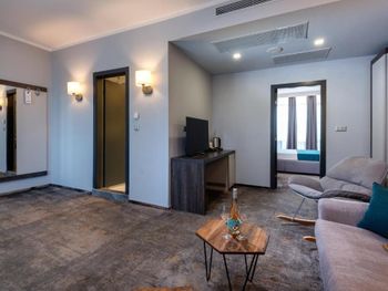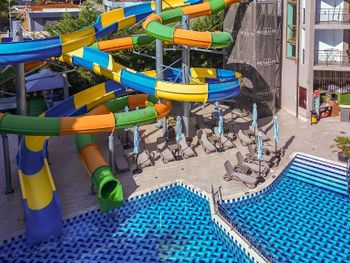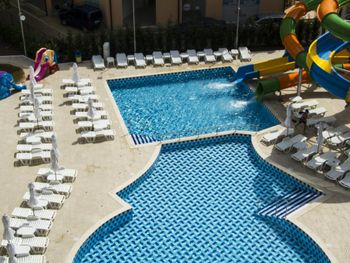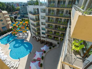 В отеле есть замечательный прохладный бассейн с двумя горками, которые подходят и для детей и для взрослых. Также очень порадовал просто огромный двухкомнатый номер с балконом. Дорога до пляжа занимает не более 5 минут