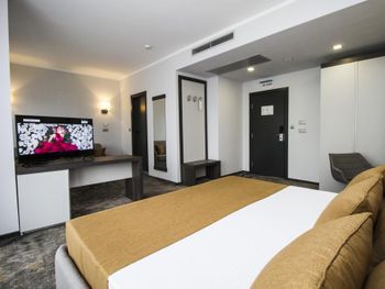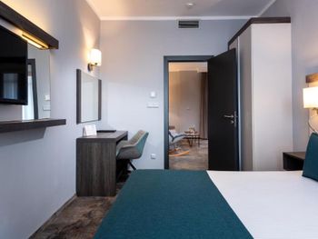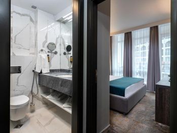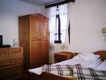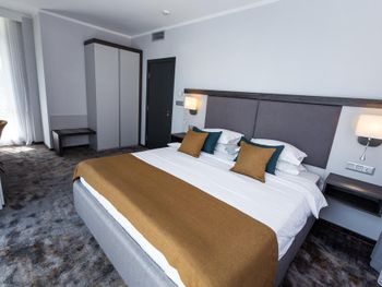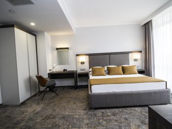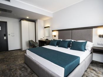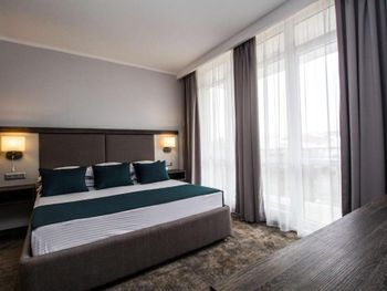 Номер большой, отличный. Очень понравился. Огромная кровать, на полу мягкое ковровое покрытие. Телевидение с дигибоксом. В номере чайник. Также в номере приготовлено чай, кофе, сахар в пакетиках. После оформления была удивлена, так как от хозяина было приветственое письмо, бутылка вина и два бокала. Полотенча меняли каждый день. Завтрак тоже нормальный. Окна выходили во внутренний двор с бассейном и лежаками. Ночью бассейн имеет подсветку, которая меняет цвета. Очень красиво. А самое главное хорошее расположение гостиницы. Она находится в центре. Рядом автобусная станция, с которой можно ехать на Бургас, а остановка автобуса, через дорогу, с которой можно поехать в старый город. Море тоже близко. Раньше останавливалась в других гостиницах, а теперь буду только здесь.
