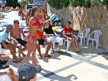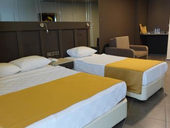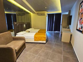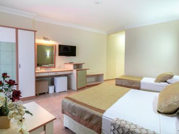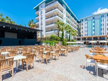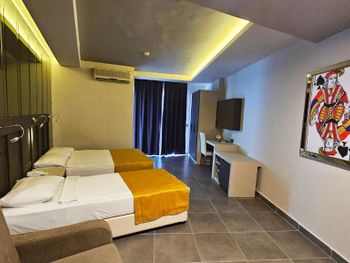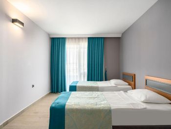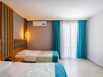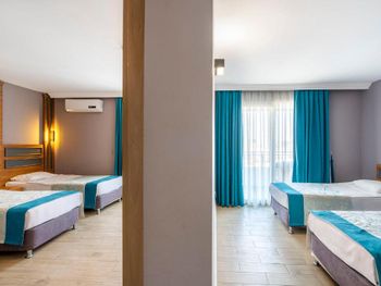 Это пакетный отель, куда привозят очень очень очень много туристов из категории «Тагил». Везде огромные очереди, чтоб попить, поесть, борьба за шезлонги, на пляже люди стоят в очереди по 50 минут чтоб набрать кучу алкоголя и бургеров. В ресторане очереди, мест не хватает, еда однообразная и не вкусная. Номер это вообще отдельная история, в примечаниях указывали одну двух спальную кровать, заселили в номер с двумя односпальными, на что ответили что все номера такие и нет проблем чтоб просто сдвинуть кровать! Спать было очень неудобно, ужасные матрасы! Но, самое ужастиков на наш взгляд это запах канализации и слышимость! Удалённость от моря! Прошу при выборе данного отеля обратить внимание на удалённость (да есть трансфер которым никто не пользуется, не удобное расписание) и что идти в отель в гору. Для нас была не проблем, но, для людей более пожилых может возникнуть затруднения! Слышимость такая, что все происходит в твоём номере. Очень плохая анимация, люди все ужасно пьют (ну ещё б, наливают постоянно, почему б не воспользоваться). Просили позднее выселение, готовы были заплатить, нам отказали. В общем повторюсь отель заточен под пакетное принятие людей. Рейтинг 2+ и никак не 4! В номере у нас никто не убрал, полотенце не меняли, воды нет. Тапочек соответсвенно тоже, хотя заявлено 4*. В общем не рекомендую. Если хотите спокойно отдохнуть, вкусно покушать, и получить эстетическое удовольствие, Вам не сюда!