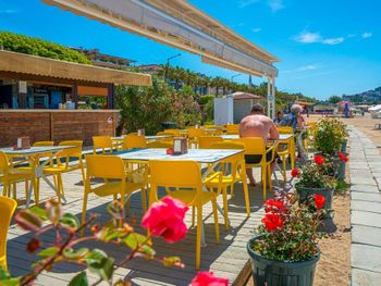 К сожалению дали номер с двумя кроватями, а не с одной большой. Я как-то упустила, что шезлонги и зонтики платно, так что мы загорали на песочке. Пляжное полотенце под залог в 5 евро. Вход в море с оголенными плитами, осторожно надо заходить.