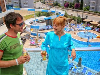 На выходе из отеля стоят столики перед бассейном, где постоянно сидят и курят посетители. Я держу ребенка подальше от мест где курят. В Турции курят везде, поэтому этих мест сложно было избегать.