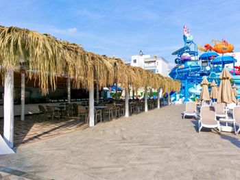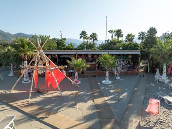 На пляже кроме воды и лепёшек, все за доп. плату. Вход в море плохой, острые камни.