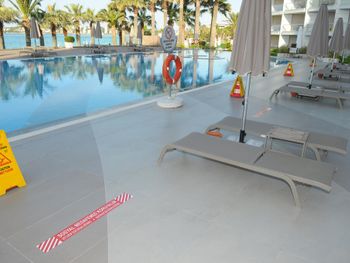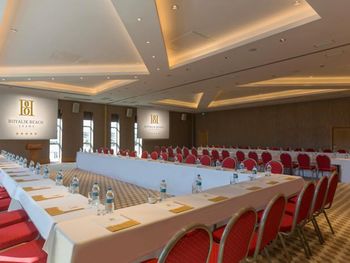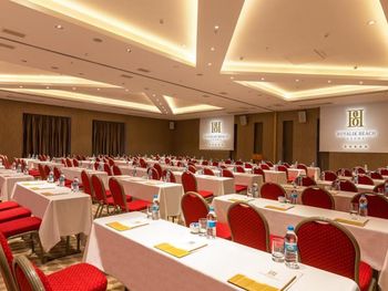 На входе никто не встретил. Интерьер везде удручающий, как пансионат... Лобби непрезентабельное, панно сзади ресепшн с гиганскими насекомыми - неприятное. Комнаты темные, покрывала и полотенца потрепанные, обои местами отслаиваются, штукатурка на потолке местами осыпалась, везде видно, что уже нужен ремонт и современный дизайн. Халатов в номере нет, шампуней, гелей и крема в баночках не было (только 1 вид геля в большой тубе). Некрасиво зону пляжа огородили какими-то пластиковыми боксами, которые портят весь пейзаж. 3 первых дня в номере был невыветриваемый запах сигарет. Пожаловались, предложили 3 других номера с таким же запахом пепельницы. В итоге остались в своем номере и ждали, когда КТО-ТО съедет из отеля и перестанет курить; особенно в туалете дымно было, постоянно вытяжку включали (которая, кстати, включена только вместе со светом, а ванная то прозрачная). Курили также ВСЕ и в зоне веранды для завтрака (и мы все время сидели внутри помещения), и на пляже, и на травке, и в зоне лаунж перед бассейном. В середине мая вода в море леденющая, но почему-то все купались, и даже дети и беременные. Вода в бассейне на градус теплее. Вода в бассейне с грязевыми источниками прям горячая, но не всем можно в ней лежать, проконсультируйтесь заранее с врачами на родине (на территории отеля такой услуги нигде не увидела, табличек о составе воды и противопоказаниях также нет). Если кто-то купается в главном бассейне и что-то говорит (а то и выкрикивает!) - это слышно и на 7ом этаже в номере с открытой дверью балкона. На ресепшн на английском говорил хорошо только 1 человек, с другими общались по одному слову через переводчик. Еду на завтрак и ужин частенько расхватывали сразу после открытия ресторана (к 10.10, например, пару раз уже не доставалось омлета), десерты на ужин иногда не возобновлялись, поэтому их сразу же по приходу себе брали.