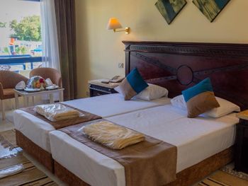 Питьевую воду дают только в день приезда,очень редко меняют бельё,старые телевизоры и кровати.Русскоязычные каналы просто ужас!Лежаки и матрасы,полотенца на пляже очень старые.