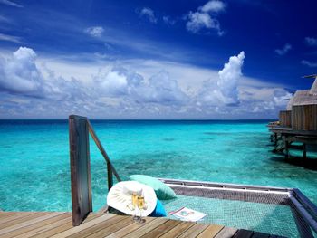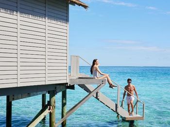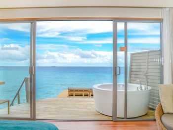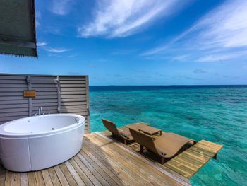 На водной вилле очень маленькая веранда, одно неверное движение и вы упадёте. Лестница в воду не очень удобная. Зачем-то сделала последняя ступенька, которую ты не видишь. Рассекла колено, когда выходила из воды. Дно очень каменистое. Тапки обязательно.