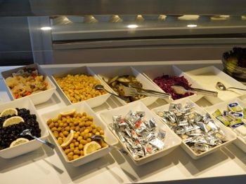 Выбор еды весьма скромный, фруктов почти нет (для нас не было проблемой, т.к. в шаговой доступности пара магазинчиков с хорошим выбором овощей-фруктов), более неприятным было отсутствие на завтраках какой-либо выпечки-блинчиков-оладий, и даже каша не всегда была, т.е. накормить с утра ребенка было той еще задачей, ну не любит он скрэмбл (