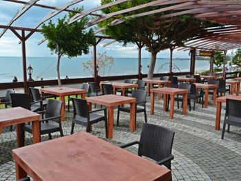 Отель находится близко к морю. На пляже имеет свои лежаки и зонты.