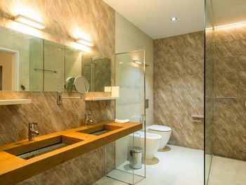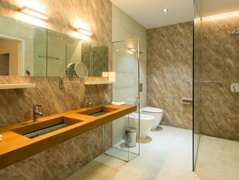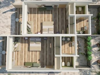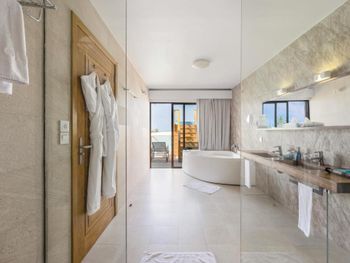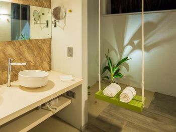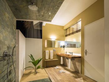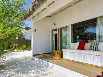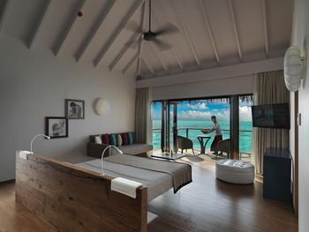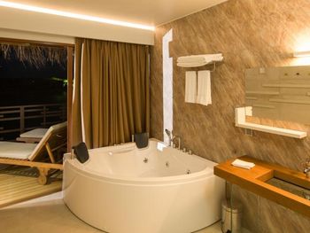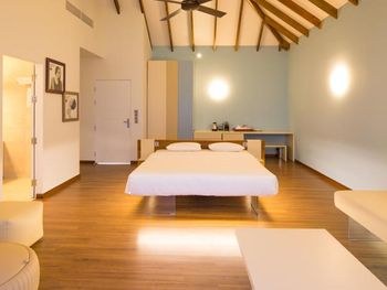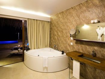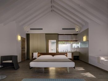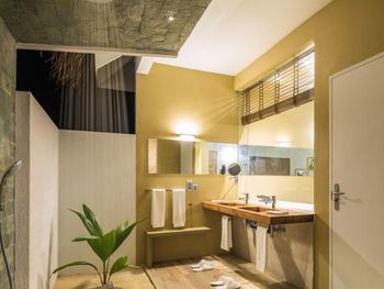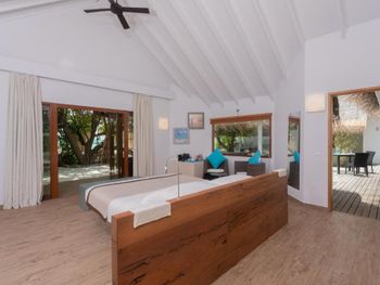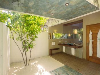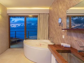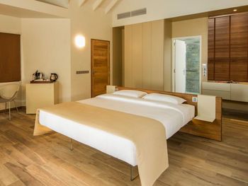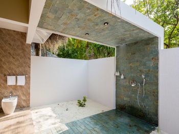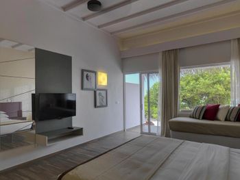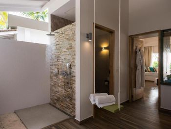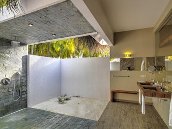 Все номера окружены зеленой растительностью, которая хорошо видна через стеклянные перегородки, отделяющие ванную комнату на открытом воздухе, что само по себе дарит ощущение единения с природой и создает свежий контраст с бескрайними просторами бирюзового моря.