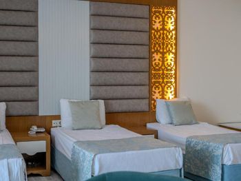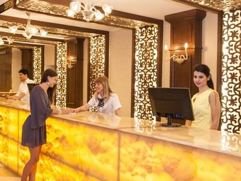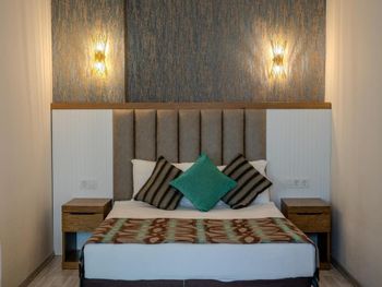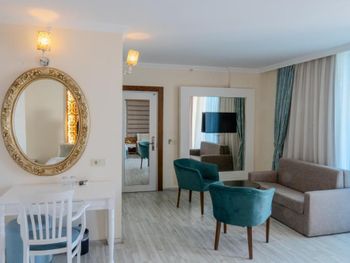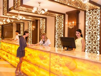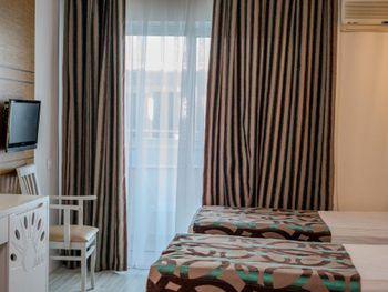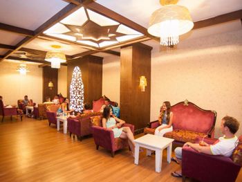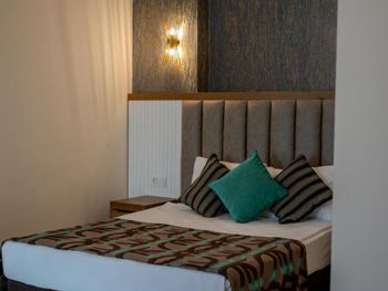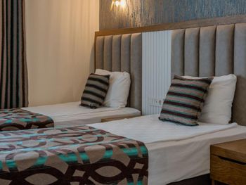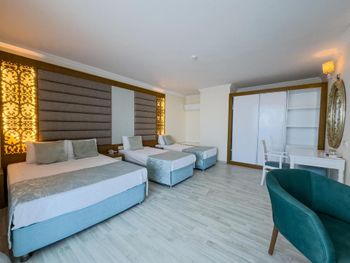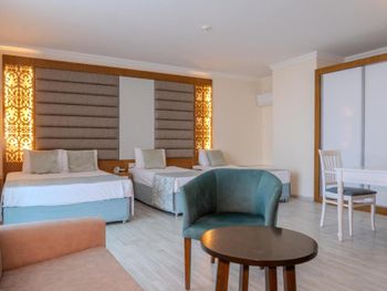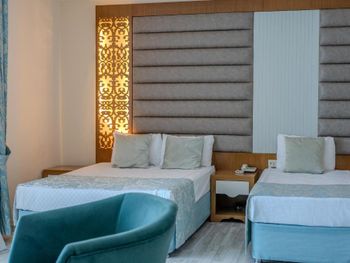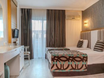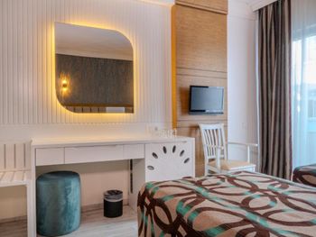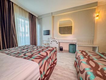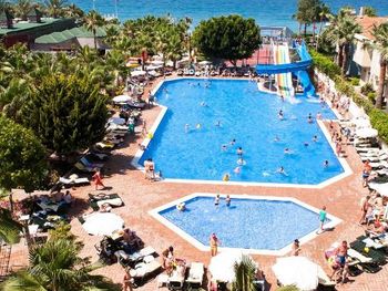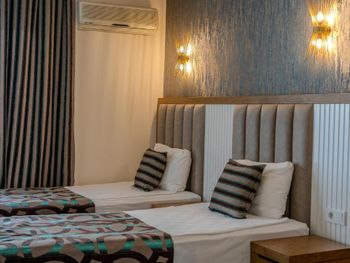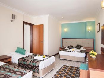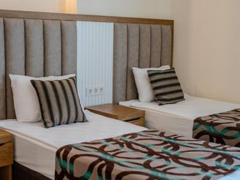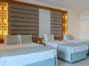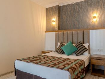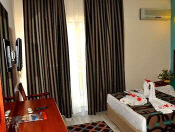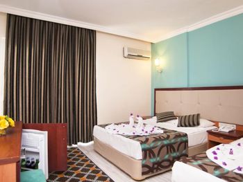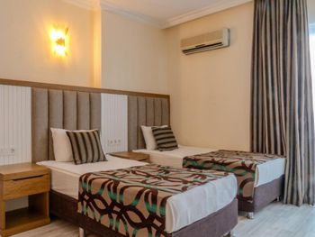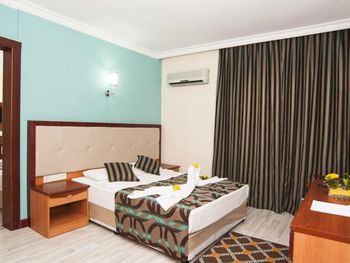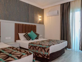 Останавливались в отеле парой, на одну ночь. Изначально видели что оценка у отеля низкая, поэтому готовились к этому заранее и особого разочарования или шока я не испытала. Утешала мысль, что это всего одна ночь... В отеле есть парковка, но мест на ней не было,хотя я заранее задавала вопрос о наличии парковки и предупреждала,что будем на машине. Кстати на вопрос мне так и не ответили.Пришлось оставить ее у дороги.Оформление на ресепшн произошло быстро, затем нас попросили подождать человека, который нас проводит до номера, и забыли о нас. Спустя 20 минут, мы сами подошли и напомнили о себе, так как боялись пропустить обед. Нас проводили в номер на пятом этаже, с видом на соседний отель. Лифт ждали долго,это был единственный раз за сутки,когда мы им воспользовались.Все остальное время исопользовали лестницу.Номер на твердую тройку, не грязно, полотенец достаточно, в душе много моющих средств. В мини-баре сок. Кровати старые, но удобные, для укрывания предложены почему-то очень маленькие покрывала, даже одному не очень удобно укрываться, а вдвоем так и вообще нереально.Хотя мы просили номер для двоих с большой кроватью, нам дали номер,рассчитанный на троих. Рядом стояла вторая кровать, взяла покрывало оттуда. В столовой, рестораном это точно не назвать, хаос. Людей много,сложно найти свободные столики, но с едой недостатка нет, всего много и все не вкусное. Из десертов практически одни желе, я такое ранее даже и не видела. Обычно турция славится своей выпечкой. Стаканы в баре грязные, со следами помады. Тарелок много, персонал вытирает их прямо в зале, что позволяет думать, что во время интенсива, посудомоечные машины не используют, ибо из этих машин посуду достают горячей и сухой. Официанты быстро убирают грязную посуду, особой навязчивости ,как написано в отзывах ранее, этом я не увидела. Персонал вежливый. Из плюсов то, что воду можно брать в бутылках без ограничения, также видела, что гости брали фрукты в номер и на пляж. Жесткого контроля нет.