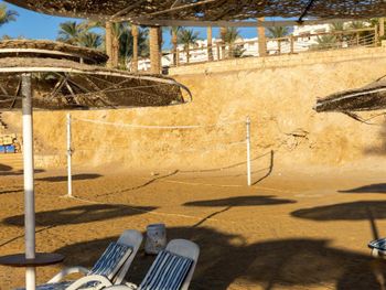 Пляж разваливается (сломанные шезлонги, зонтики тоже сломанные, поддон в море тоже разваливается).