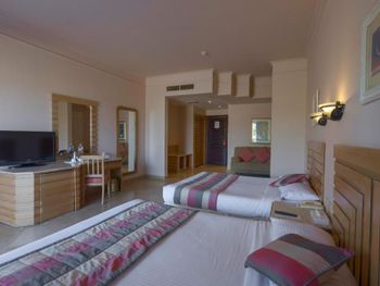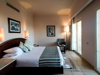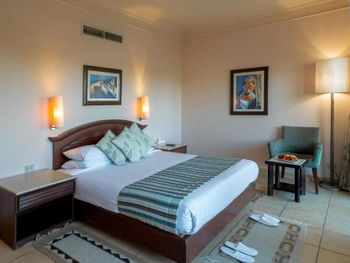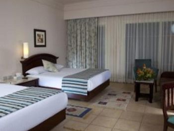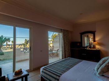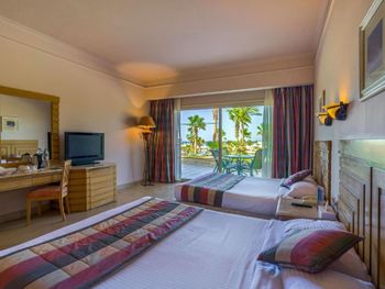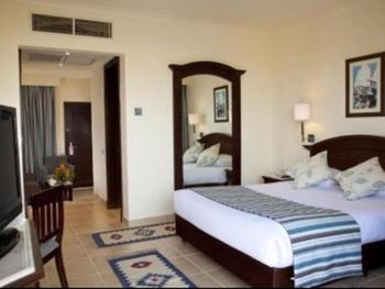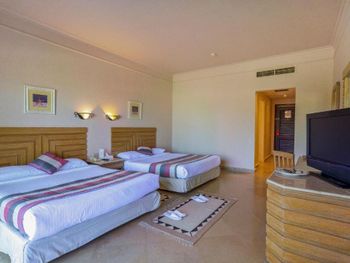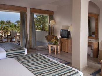 В оформлении просторных номеров отеля Hurghada Coral Beach использованы большие французские окна. В числе удобств — диван-кровать, спутниковое телевидение и собственная ванная комната.