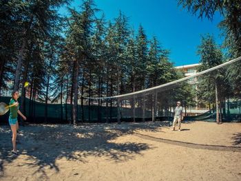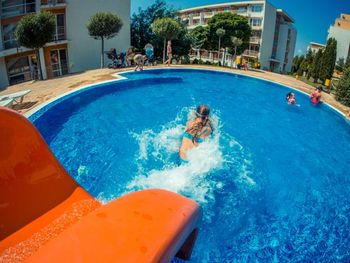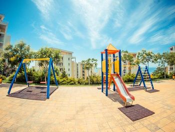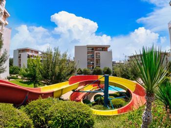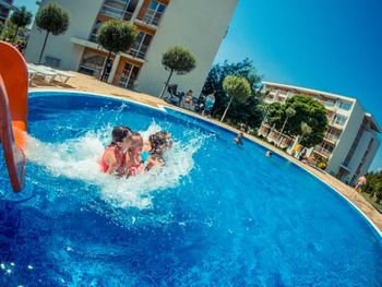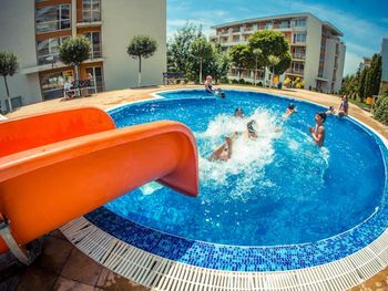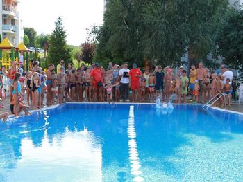 Within the complex there are 2 restaurants, 10 swimming pools, one with artificial waves, 5 swimming pools for children with water attractions, 6 children`s playgrounds. Guests can make use of the hairdressing, manicure and pedicure services. A relax area with sauna, and a fitness centre are offered at a surcharge. A tennis court, a mini golf and a mini football pitch are offered as well.
