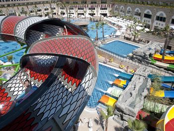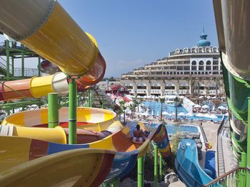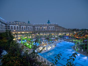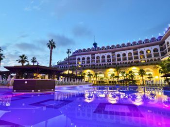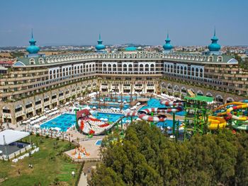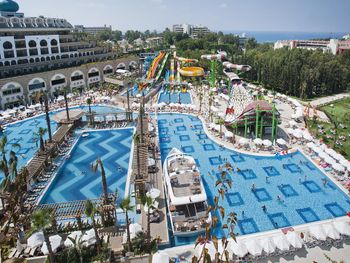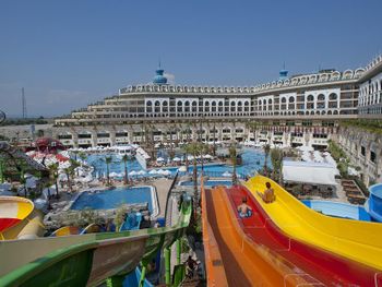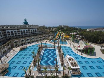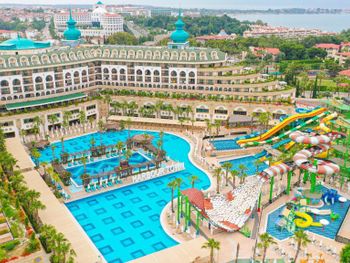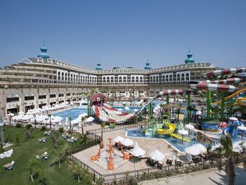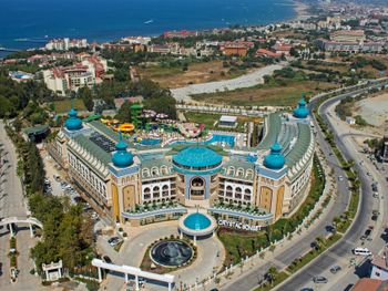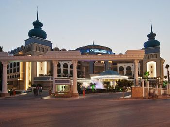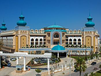 Курортный спа-отель Crystal Luxury Sunset расположен рядом с морем. К услугам гостей собственный песчаный пляж длиной 250 метров, открытые бассейны, 11 водных горок и спа-центр. Отель отличается уникальной архитектурой и работает по системе «все включено», а его название символизирует кристальную чистоту воды в Средиземном море.