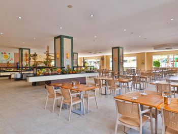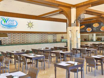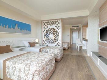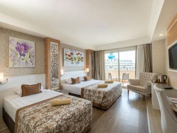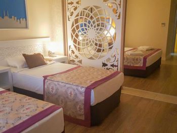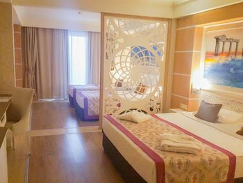 Разместили без вопросов раньше времени заезда и бесплатно, сразу отправили на завтрак, без волокиты и церемоний. Номер мы сразу взяли чуть лучше чем заказывали изначально, отличный вид на внутренний двор и бассейн! Однако если вы или ваши дети спите чутко, подумайте дважды перед выбором такого номера: веселье по вечерам (бывало и до 23:00) может не веселить, а мешать спать. Для нас это проблемой не было, иногда наоборот открывали дверь на балкон чтобы послушать музыку. Номер как на фото и даже лучше, чистый, не тесный, всё в рабочем состоянии. Убирали хорошо и каждый день, наличие или отсутствие чаевых решительно никак не влияло ни на качество уборки ни на приветливость персонала. Персонал вообще выше всяких похвал, всегда приветлив, вежлив, предупредителен, отношение к детям прекрасное, да и к взрослым тоже. Особенная благодарность ребятам-барменам из King Cobra Pool Bar! Отличная кухня (нам за две недели так и не успела надоесть). Чистый и красивый ресторан, места хватало всегда, всё радует глаз. В некоторых местах скользкая плитка (когда мокрая), с этим поосторожнее. Бассейны ровно такие как на картинках, людей в них не так чтобы битком, так что можно рассекать на матрасе в своё удовольствие. Аквапарк зачётный, горки не экстремальные, но весело провести время можно, а очередей практически нет. Пляж мы особо не посещали, но пару раз туда прогулялись, можно по живописной тропинке минут за 10 дойти, можно за минуты 4 на шаттле, но я ума не приложу, зачем он вообще нужен, когда море так близко. Никаких дорог переходить по дороге на море не надо. В отеле масса возможностей провести время активно: аэробика, водное поло, волейбол, теннис большой и маленький (тоже бесплатно, если есть ракетки) и т.д. и т.п. Детская площадка небольшая, но дети там резвятся, детский водный городок тоже хорош, правда вода там холоднее чем в бассейнах и тем более на море. В отеле отдыхают англичане, немцы, турки, арабы (не знаю из каких стран) и люди из бСССР. Атмосфера очень дружелюбная!