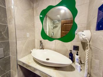 Номера старые, нет многих элементарных косметических принадлежностей типа халат, тапочки, зубная паста и щетка. Были шампунь, лосьон и жидкое мыло. Но бутылки были пустые. Гель для душа был.