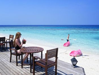 На Мальдивах девятый раз. Отдыхали и на локальных островах и в хороших отелях 5*. В этом отеле есть очень многое для отличного и недорогого отдыха на Мальдивах: близость к аэропорту и, как следствие, неутомительный быстрый и недорогой трансфер, свой большой риф и, как следствие, огромное количество морских обитателей (как и везде на Мальдивах риф мертвый, но он начинает возрождаться), из-за небольших размеров острова практически все бунгало имеют прямой выход на пляж. Остров небольшой, много растительности. В каждом бунгало уютная веранда с удобной мебелью, где приятно проводить время в течении всего дня, возвращаясь в комнату только для сна. В комнате есть сейф, маленький холодильник, маленький чайник, два стакана, две чашки и одна (!) чайная ложка, пополняемые запасы пакетированного чая, растворимого кофе в пакетиках и сахара. Кровать удобная, но достаточно жесткая. В санузле душевая лейка статичная, не снимается, для семей с маленькими детьми мытье будет несколько проблематичным. Все цены в баре указаны с учетом всех налогов. В день на человека дают один литр воды в многоразовой стеклянной бутылке.