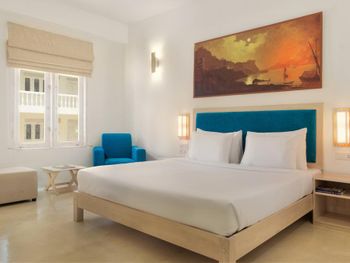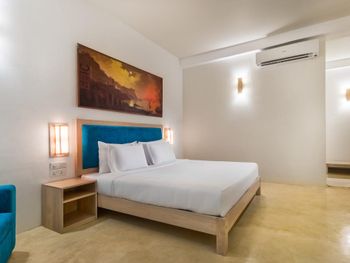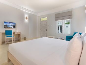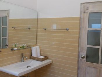 Отель состоит из двух корпусов, один полностью жилой, во втором еще располагается кухня и ресторан. Между корпусами уютный дворик вымощенный плиткой. Номера достаточно просторные, у нас был делюкс, но в номере довольно аскетично, небольшой шкаф с сейфом, маленький холодильник, письменный стол, две прикроватные тумбочки, небольшое кресло и кровать, ну и телевизор с кондиционером. Номер выкрашен бежевой краской, кое -где требующий уже ремонта, на потолке и стенах можно увидеть трещинки, пятна и потёртости. Пол бетонный, вымощен плиткой. Ванна достаточно просторная, совмещена с туалетом, стены обделаны панелями под мрамор, единственный ее минус, это то что в ней есть небольшое окошко которое правда можно закрыть, а вот деревянные жалюзи над ним не закрываются и из-за них в ванной постоянно жарко и душно и залетают насекомые.