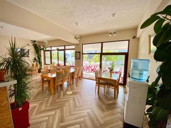 Очень приятный молодой человек нас заселил, помог занести вещи, обратите внимание, что там лестницы. Нам не критично, но вдруг кому-то это не подходит. Внизу есть ресторан, но мы были до начала сезона, и он еще не работал, там покормили только завтраком, который был очень хорош )) Есть балкон, сушилка, прищепки, шкафы и холодильник в номере, очень удобно.
