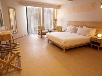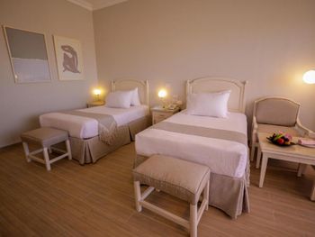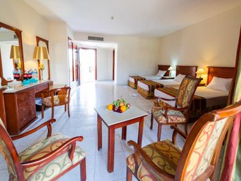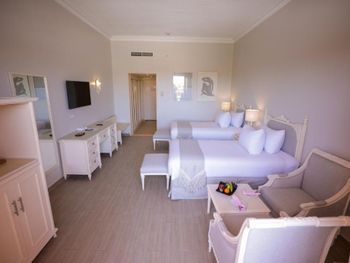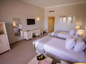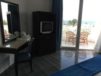 Нам на следующее же утро поменяли номер на 4-м этаже с отличным видом на территорию отеля, бассейны в сторону моря (но очень в плохом эксплуатационном состоянии) из главного корпуса отеля на номер в одноэтажном домике с террасой по нашей просьбе без доплат.