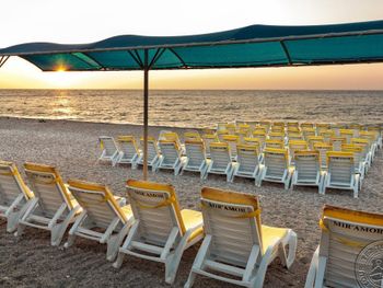 Песчаный пляж, лежаки, шезлонги, зонтики.