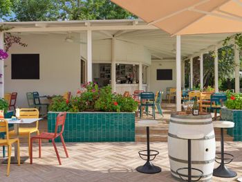 Есть открытый бассейн, бар и все удобства для приятного времяпровождения на месте. Также есть небольшой тренировочный зал.