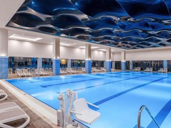 На территории отеля 5 бассейнов (детские с горками, взрослый с аквапарком, на крыше- Инфинити). Разнообразный завтрак, обед и ужин в ресторане, снек перекусы до обеда и после, бары, лобби, мороженное, без очередей доступ со всех точек отеля и территории.