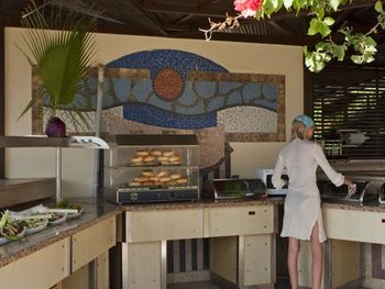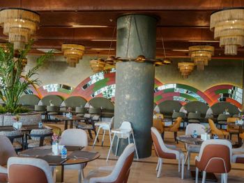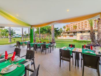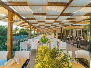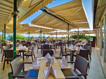 Столов на всех не хватает, сначала все бегут занимать, а дальше начинается беготня по залу - от одной раздачи к другой, суета и шум. На веранде можно курить, как и везде на территории, хотя очень много детей от грудничков и далее. Еда так себе , без изысков - курица, рыба, соя, были дни, когда только соя. Обед очень короткий , всего полтора часа - трудно успеть. И именно в обеденное время раздают мороженое: всё для экономии либо мороженое, либо обед. На улице в баре мало кто обедал, т.к. выбора никакого, но если нужно взять картошку-фри, так идти надо в другой бар, как-то всё неудобно. Пироженки выдавали, именно выдавали, в лобби-баре с 15-17 часов, опять экономия, не все хотели с пляжа приходить в корпус. Пляж большой , но иногда лежаков не хватало, насыпной песок, а вход в море не очень, галька разного размера, ходить трудно.