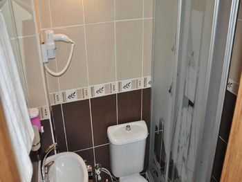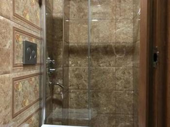 Очень тесная ванная комната. Раздвижные двери душевой кабины сломаны.