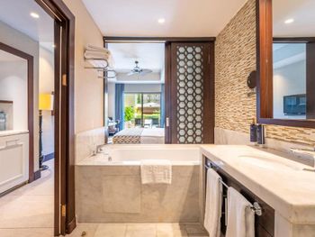 Роскошный и дорогой отель! Жили в люксе на лагуне - шикарный бассейн, свой ресторан. Очень качественное питание и алкогольные напитки (местного алкоголя нет). На пляже и у главного бассейна свободных мест нет. Но есть решение вопроса. Отдельная часть пляжа платная - там не многолюдно, свой ресторан. Цена 80 евро за 2 лежака и зонт. Также есть бунгало и на пляже и на пирсе по 500 евро. Спа - замечательное, но очень дорогое. В общем - отличный отель и отдых.