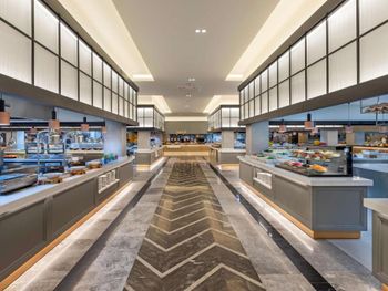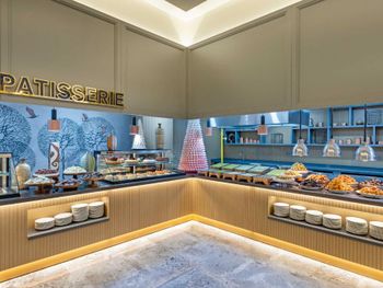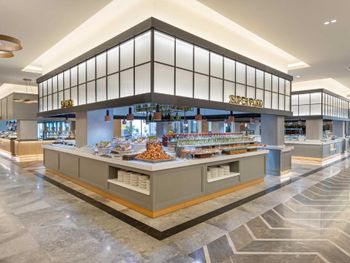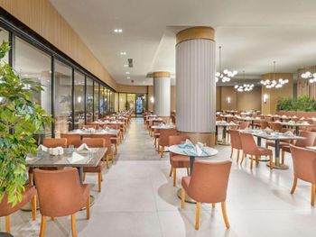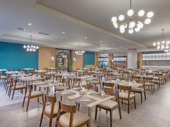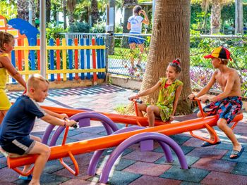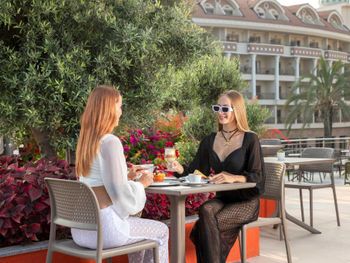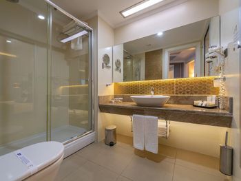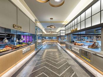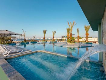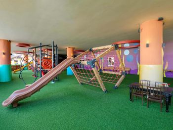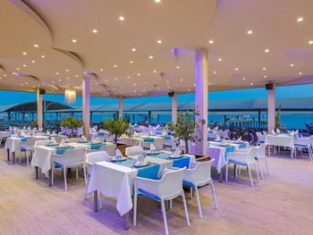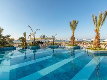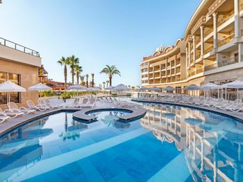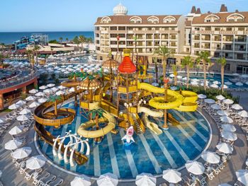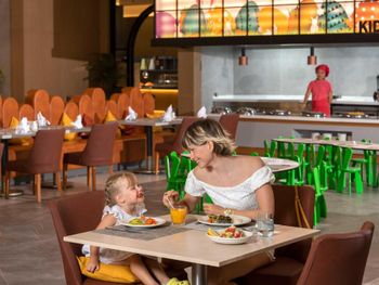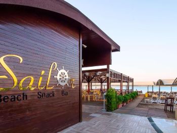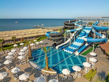 Самый большой плюс - еда. Ее много, на любой вкус и это просто отвал всего, настолько вкусно и разнообразно. Рыба, мясо, супы, суши-роллы, салаты, овощи, фрукты, всего навалом. Пляж песчаный, но у входа в море камешки - берите аквасоки, если не любите довольно болезненный массаж ног. Есть пирс, на котором бар и лежаки. Замечательный радушный персонал, нам поменяли номер при первой же просьбе (окна выходили на сансет бар, было громко вечером), с ребенком лучше брать корпус потише, мы в итоге жили в корпусе I, и там шума не было вообще, с балкона был вид на море и горы, шикарно. Бассейн большой, но мы не плавали, ходили на море и в оба аквапарка. Взрослый аквапарк работает с 10 до 12 и с 14 до 16, хотелось больше. Детский практически без перерывов до 18. В анимации не участвовали. Шоу как везде. Один раз было реально крутое шоу с трюками на мотоциклах. Анимация в детском клубе хорошая, все девушки очень доброжелательные, есть русскоязычные. В отеле много немцев, видимо, это один из «немецких отелей». На территории много котов. Есть отдельный взрослый бассейн с баром, куда вход только 16+. Есть кофейня с вкуснейшими десертами и кофе из капсул. Территория небольшая, но все продумано - например, детская площадка в тени (на ней как раз сансет бар, где в один из вечером была шикарная живая музыка, мужчина пел супер-профессионально). Формат для семейного отдыха - для детей много всего.
