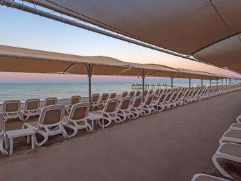 Отель 5 звезд- уже по факту не соответствует заявленным звездам. За 250 000 рублей на 5 ночей - это был самый провальный отель в моей жизни. Там не красиво уже все. Полотенца совсем не белые, в пятнах и дырках, лежаки/столики разбитые, уличные зонты в дырках, постельное белье не по размеру одеял/кровати и все в огромных каташках, застиранные пляжные полотенца в дырках и с пятнами. Весь отель давно устал. Туалет на пляже как в аэропорту. Весь отель давно пора отмыть, начиная от стен. Уборка посредственная. Тряпкой туда-сюда поводили и все. На пляже песок весь в окурках, семечках, склянках, в горшках мусорных тухнут фрукты с предыдущих дней. Зона лежаков выглядит хуже чем в Адлере. Семейный отель. В море многое детей. Спасателей на вышке за 5 дней так и не увидела. Их попросту нет там. Все картинки на букинге сделаны видимо в момент открытия отеля. Поверьте, там все уже давно не так. И я искренне не понимаю, почему такие отзывы, и неужели за такой ценник людям нормально загорать на полотенцах с дырками, спать на отвратительных подушках с катышками. И по 5 раз за ночь вставать охлаждать номер. Потому что на минимальной позиции он дует так, что сносит. Сидушка на унитазе каталась. Попросила «службу заботы» починить ее. Сказали утром придут в 11.00. Не пришли) сказали, что постельное белье заменят, заменили на одной кровати - минуточку внимания, на новое из упаковки, запах покупного белья с линиями как было сложено в упаковки. Серьезно? - подумала я. И просто оставшиеся 4 дня не вылезала с ребенком из моря. Чтобы не видеть остального кошмара)