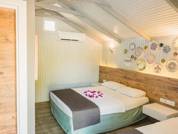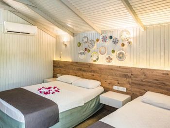 Маленький свой домик с конденсатором. Море рядом, свой чистый пляж. Очень удобный. Рядом ресторан и маркет. Прекрасный персонал.