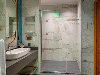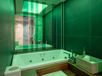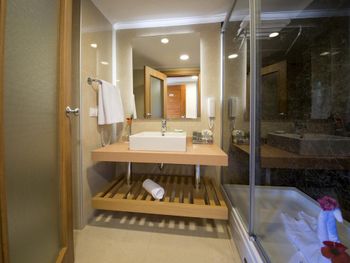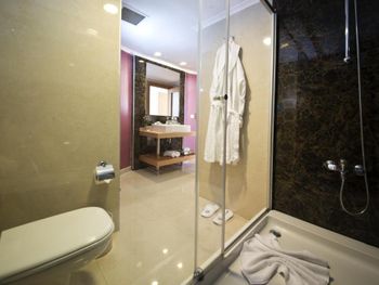 Дело в том, что стена ванной комнаты стеклянная и поэтому, когда ты моешься в своей ванной (особенно вечером), люди внизу у бассейна могут делать ставки с какой полки ты возьмешь полотенце... по сравнению с этим кажется ерундой, что и еще одна стена ванной комнаты прозрачная! Вторая стеклянная стена граничит с вашим же балконом. Поэтому, даже если нет зрителей внизу, то можно переглядывается со своим «родным» соседом по номеру. Это, на взгляд архитекторов, интереснее, чем перечитывать состав освежителя воздуха (если вы понимаете о чем я)... За 10 дней мы научились мыться в полумраке, напрочь откинув идею включать основное освещение. Я искренне надеюсь, что эта проблема заканчивается этажом выше..