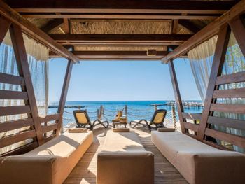 Вход в море ужасный, валуны ноги переломать можно! Вода мутная! Напитки так себе!