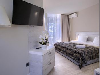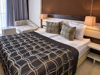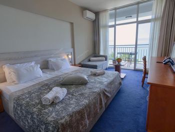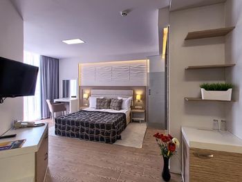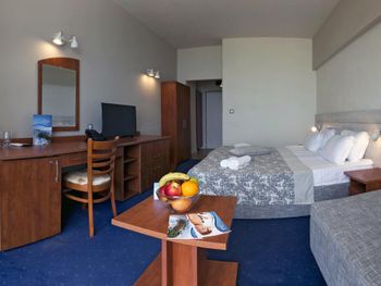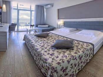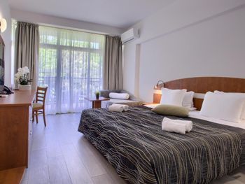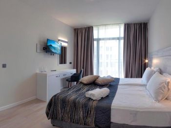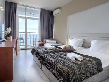 Приехали в отель в 10:00 и пришлось ждать до 14:00. Понимаю, что заселение с 14-ти, но в отеле точно были свободные номера на тот момент, когда мы приехали. Хотелось бы, чтобы отель был более снисходителен в этом вопросе и заселял раньше, если есть такая возможность. И еще - плохо, что у отеля нет своего пляжа. Рядом платные лежаки, но очень дорого - 27 лев за день, дороговато !, А общий пляж грязноват и хотелось бы, чтоб его чистили.
