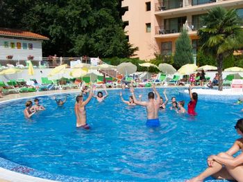Персонал приветливый. К сожалению парковка оказалась платной 20левов сутки. Бассейн был теплый. Очень вкусное питание. Несколько видов мяса было всегда, свинина,курица,кролик. После обеда пицца,картофель фри и мороженое. В барах с 10.00 до 22.00 всегда есть напитки алкогольные,без алкогольные,кофе и фрукты,печенье, кексы,сендвичи. Голодными никто от туда не уходил) на фото завтрак