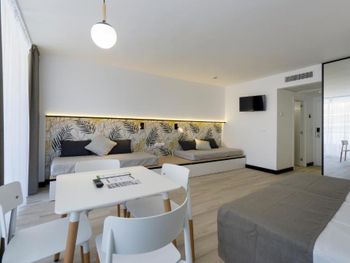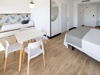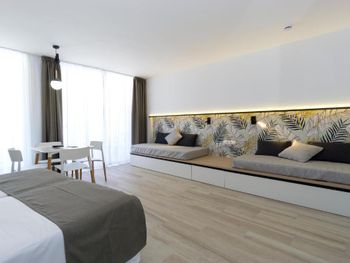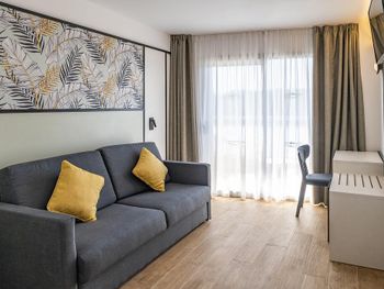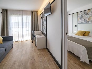 Отличный отель, новые номера, у нас был номер на 45 кв., - большой , хорошая косметика, есть холодильник, обеденный стол. Не большой аквапарк для детей. Хорошее питание. 3 бассейна. Вечером анимация.