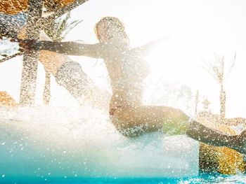 Использовать круги и всякие надувные штуки нельзя, зато сигать взрослым и детям в без того забитый бассейн можно. Это спасателей не интересует. Поэтому будьте готовы, что если вам все таки удастся выбить себе место под солнцем, то вас и ваши вещи постоянно будет заливать водой, а вас и ваших детей будут сносить люди, прыгающие в бассейн с разбега и не смотрящие по сторонам.