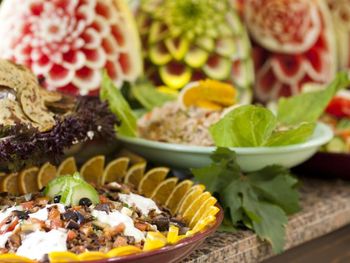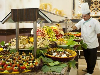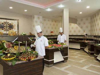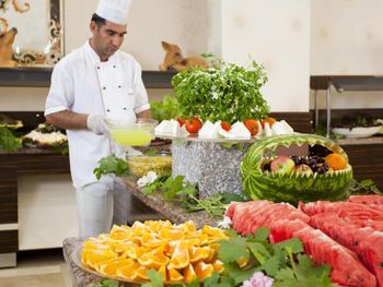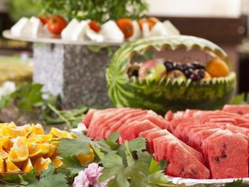 В первый раз такое встречаю и это прям выбешивало, что чтобы нормально поесть и выбрать из всего ассортимента блюд ( особенно я имею ввиду фрукты - арбуз), то вам надо приходить на ужин непосредственно к началу, арбуз кроме дня отъезда выносили один раз, кто не успел тот опоздал, ваши проблемы называется. Т.е.если ужин с 19.00, и ты пришёл на ужин в 19.20, то идёшь искать место чтобы сесть, на всех столах стоят тарелки с набранными арбузами, а арбузов больше нет и тебе шиш. Причём при этом у них стоят арбузы в форме декора, целые с вырезанной надписью на кожуре, или просто с бахромой кабы вырезанной, которые трогать нельзя!!!! Но они свежие. Получается что если вам так накладно и вы выносите поднос с арбузом только один раз за ужин (на завтрак и обед тем более его нет, у бара тоже никаких фруктов в дневное время), то порежьте эти три арбуза, не декорируйте, отдайте отдыхающим. Получается что они их декларируют, а потом выкидывают, какой то бред. Получается что если вы хотите поесть фруктов то вам не в этот отель.