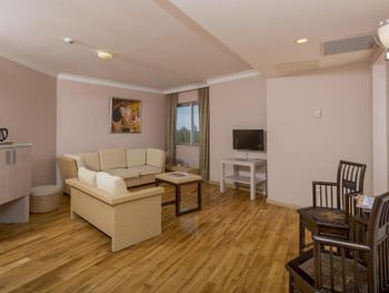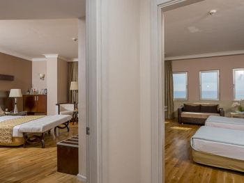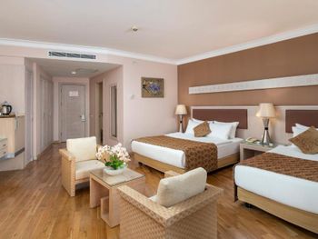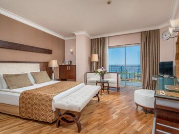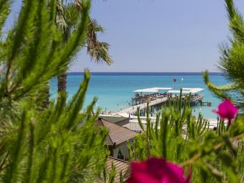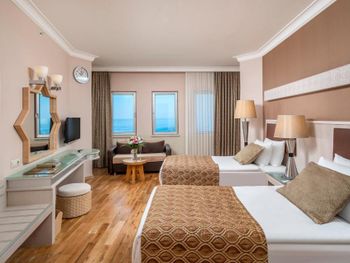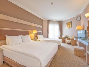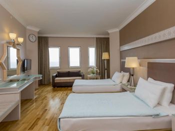 Хороший отель. Питание разнообразное . Приветливый персоонал, говорящий на русском языке. Красивая, цветущая территория Недалеко есть торговый центр и большой базар. Раз в неделю через дорогу от гостиницы приезжает привозной рынок с одеждой. В минибаре кроме воды соки, минералка и лимонад. Хорошие, просторные номера. Кому-то может не понравиться что галечный берег и сразу глубоко но для нас это не проблема. На пляже есть деревянные настилы и если заходить в воду с пирса, то ноги останутся всегда чистыми. Это лучше, чем бегать по горячему песку. Для тех кто хочет купаться с берега можно запастись специальными тапачками. Пирс ещё очень удобен во время сильных волн. Когда с берега нельзя купаться , то с пирса вполне безопасно.
