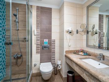 Просторный номер, удобная душевая. Еда разнообразная. Давали красную рыбу, креветки и раков по разу за неделю, НО их хватало только на первых счастливчиков которые смогли урвать :) Вкусный кофе из кофемашины Нестле, бесплатные чистые хамамы и сауны, есть соляная пещера. Хороший крытый бассейн, есть небольшой бассейн типа джакузи. Отличный мини клуб для детей от 4 до 12 лет, вечером с 20 до 20:45 включают аттракционы для детей. На территории два детских батута Бассейны с горками, НО в ноябре вода была дико холодная, непонятно как можно ими пользоваться. В ресторане есть комната для детей где стоит телевизор с мультиками, игрушки и родители могут спокойно поесть. Пляж большой, места хватит всем. Бесплатный пополняемый мини бар: кофе, чай, вода, пепси, сок. С водой проблем нет, всегда есть горячая и хороший напор. На ресепшене отлично говорят по русски, можно взять утюг и погладить вещи в "гладильной комнате", комната ужасно смешное место, а доска это просто недоразумение, но если надо всё получится :) в 15 минутах ходьбы Алара гранд базар в нём же мигрос, цены хорошие, можно многое найти, видели что ходит шатл видимо бесплатный, но не пользовались. Прекрасные котики, кормите их. В ресторане подают варёную курицу, они ее с удовольствием едят ;)