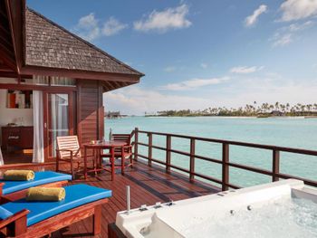 Относительно новые водные виллы grand water villa находятся на втором острове отеля (dream island), что отлично для желающих уединиться и прочувствовать, что такое Мальдивы (тк основной остров достаточно шумный, и по вечерам похож на Турцию)) Но если у Вас FB, то в ресторане на dream island будут сервировать только завтрак и ужин, а на обед надо будет идти/ехать на основной остров. Также туда придётся добираться, если Вы хотите заняться водными видами спорта или отдать ребёнка в детский клуб (в котором кстати есть русская девушка-воспитатель). От grand water Villa до ресепшн и ресторана на основном острове идти пешком минут 15-20, гольф-кар курсирует постоянно, но часто нет мест… Вообще отлично, что в этом отеле разрешено размещение на водной вилле с ребёнком. Нашему 6,5лет и он умеет плавать, ему очень понравилось! Ночью к нашей вилле приплывали акулы и скаты. Также всю живность вечером можно увидеть на пирсе у дайвинг центра (основной остров). Еда в ресторанах отеля однообразная, но в общем и целом данный вариант - хорошее сочетание цены и качества!