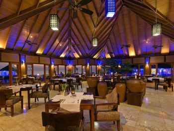 Отличное расположение отеля на 3 островах, не смотря на заполненность отеля на пляжах мало народу. Очень хорошие пляжи с белым пескои, лазурное море и пышная растительность. В море нет медуз, планктона , морских ежей, очень комфортная температура воды. Есть свой риф с богатым подводным миром, включая черепах, маленьких акул и местных скатов манта. Удобное расположение нашей комнаты в бунгало - все рядом. Еда в ресторане разнообразная без уклона в острую национальную кухню, как, например, на Бали. Есть выбор еды для детей.