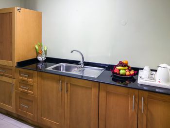 Пора делать ремонт! Старое всё буквально! На полу грязный ковролин. Окна ужасно грязные и не открываются даже на проветривание. Позвонил на ресепшн,чтоб принесли стаканы в номер- так и не дождался. На второй день сходил сам! На кухне нет НИЧЕГО,от слова СОВСЕМ НИЧЕГО! Зачем такая кухня,такие апартаменты?!! Вообщем,на одну-две ночи,не больше туда,друзья!