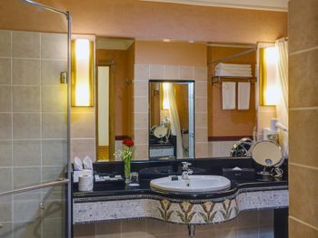 Сантехника, двери и пол заслуживают отдельного взимания. Прилагаю фото. Кран с водой карал, в душевой дверь не закрывалась, раковина облезла. А унитаз расположен так за дверью, что ты спотыкаешься об ограничитель двери ногой. Это 4 звезды как будто бы. Я очень разочарована таким сервисом в ОАЭ.