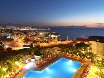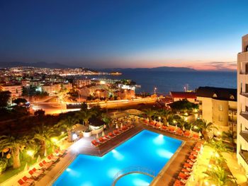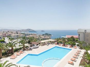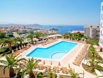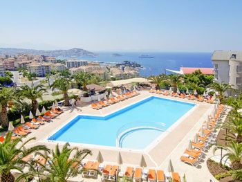Вид из отеля просто необыкновенный, нам повезло вид из номера был на море и Кушадасы. Кормили много 5 раз в день. Еда разнообразная, вкусно. Алкоголь местного производства включен в стоимость, пей сколько хочешь. Вечером анимация и дискотека.
